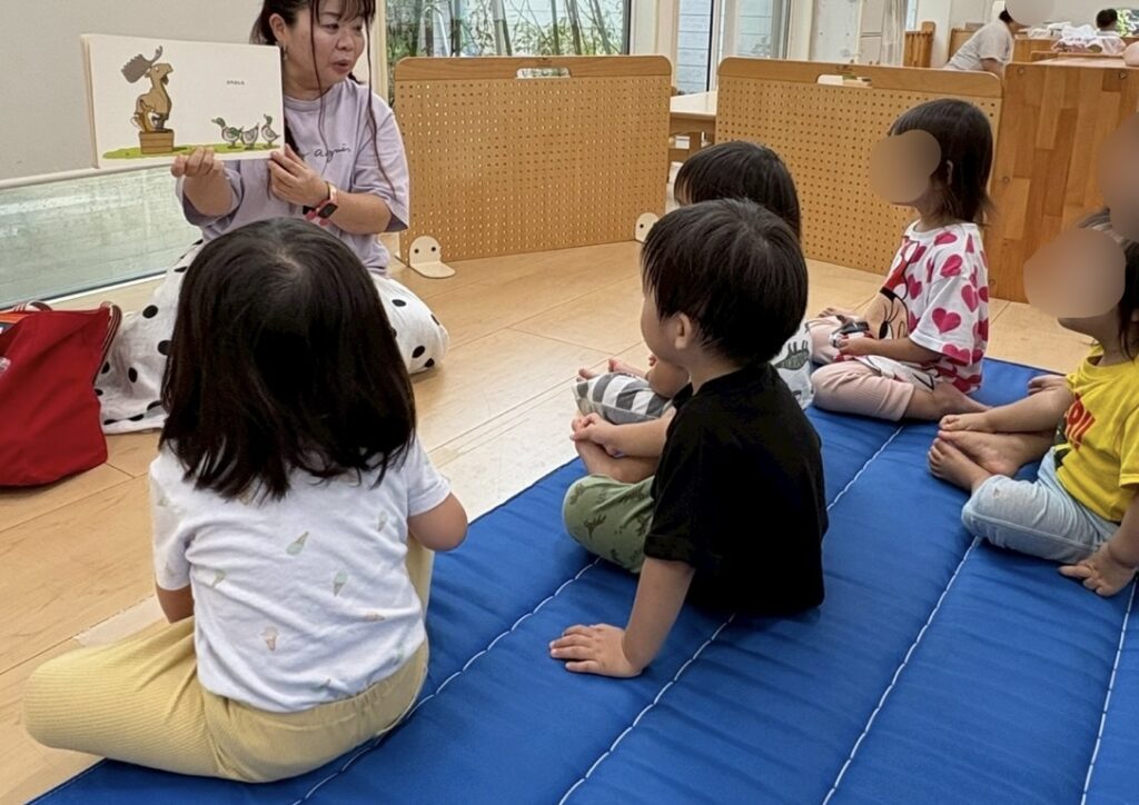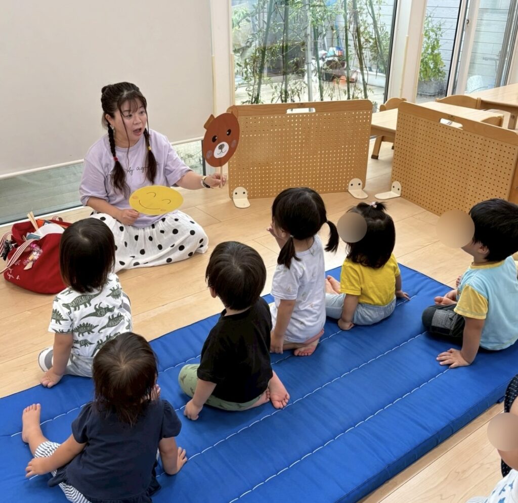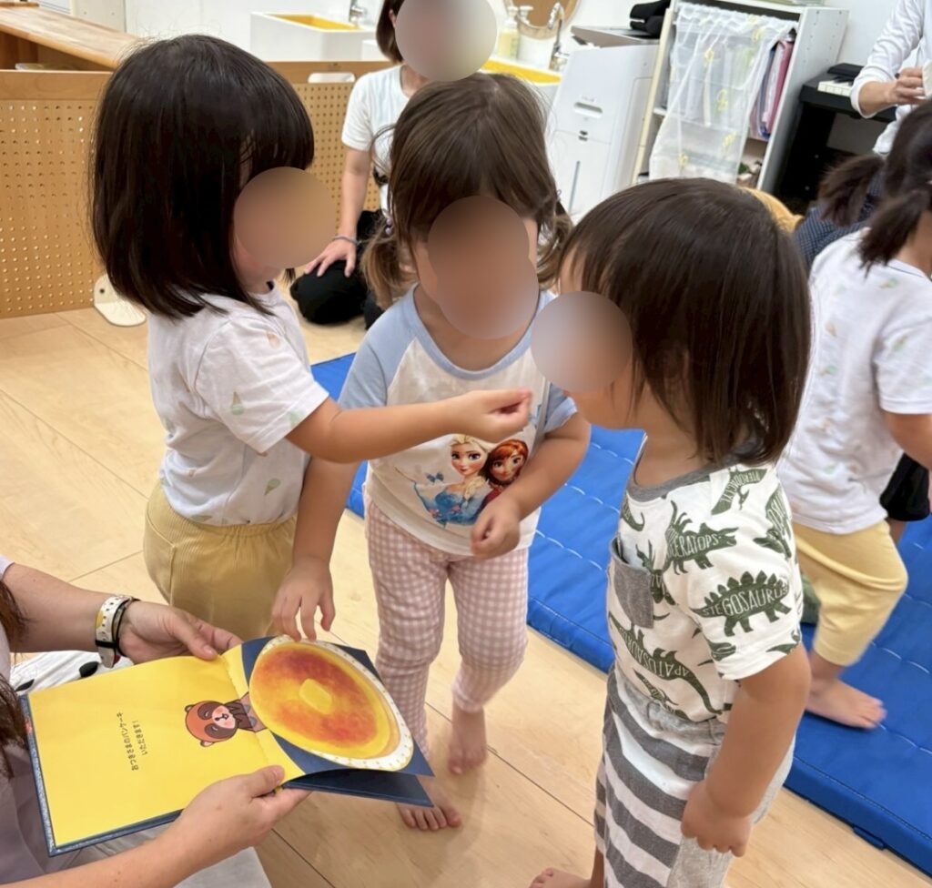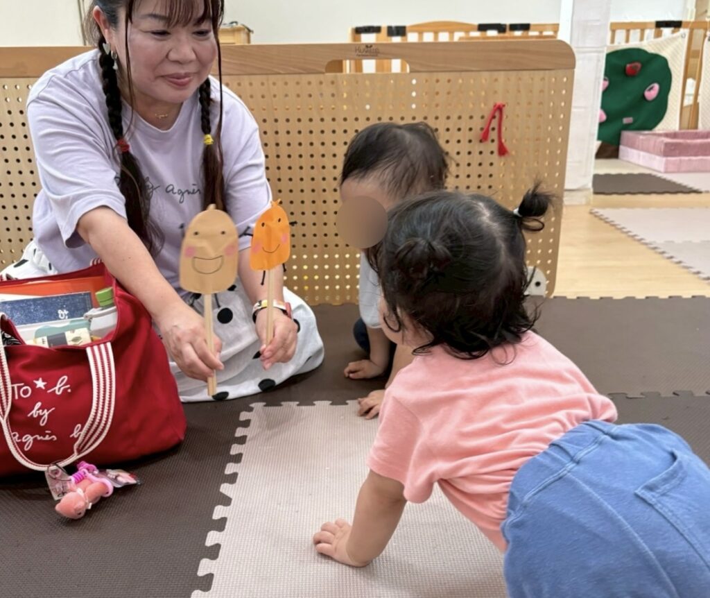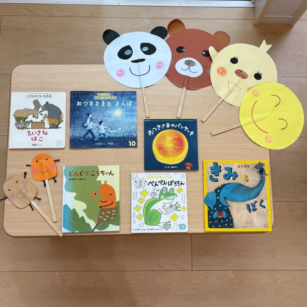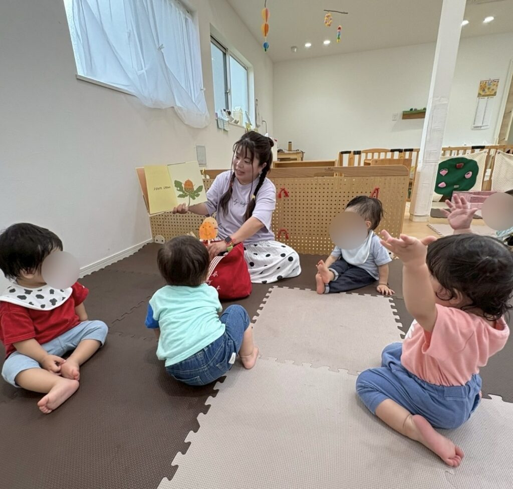 0歳児さんは、絵本にあわせて”どんぐりころちゃん”のわらべうたを楽しんでいましたよ。