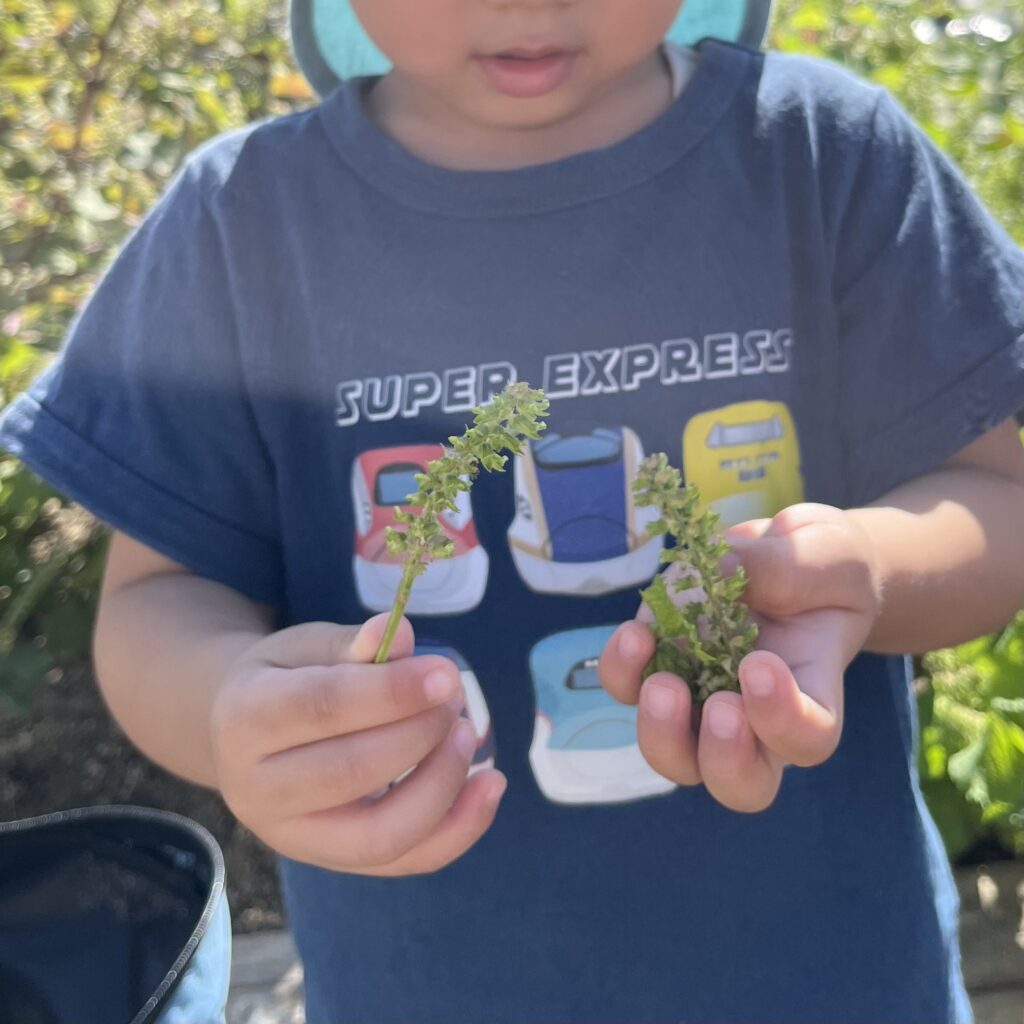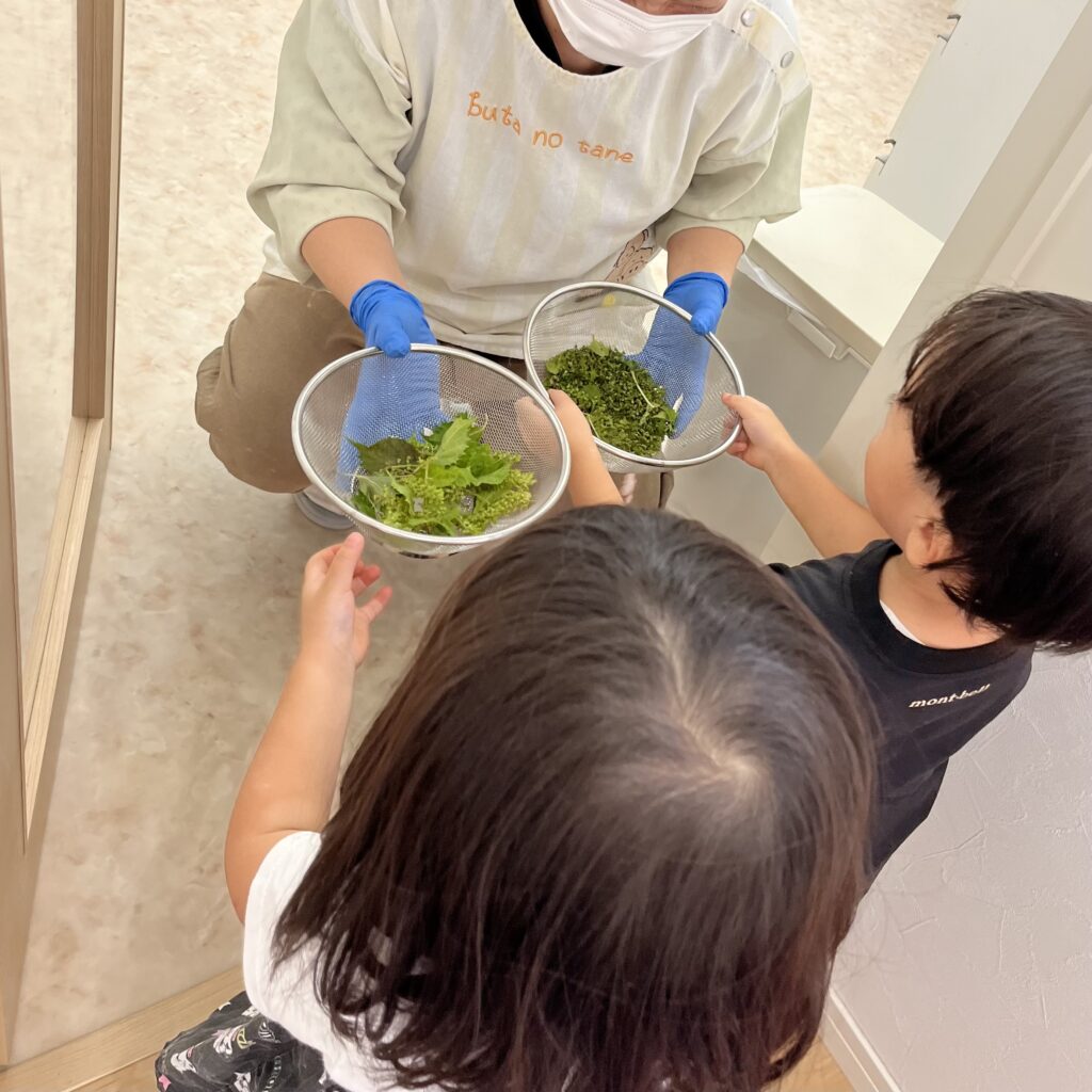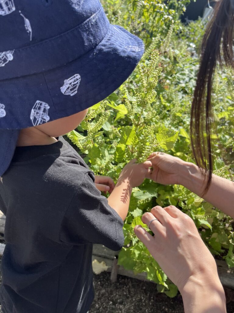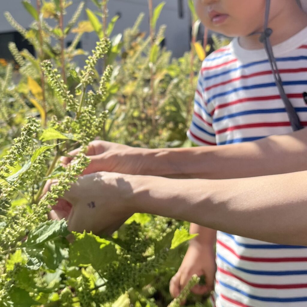2歳児の子どもたちと一緒に、園の畑で育ったシソの実を収穫しました。