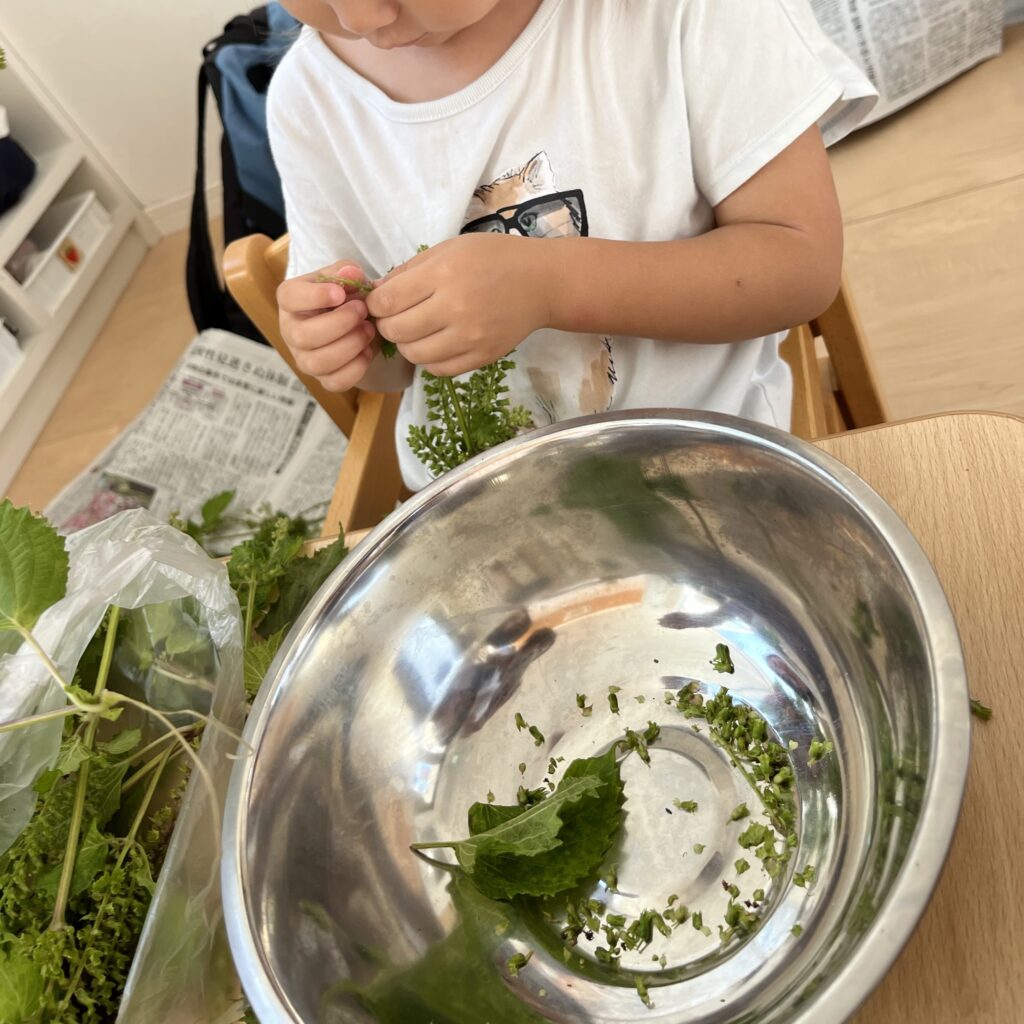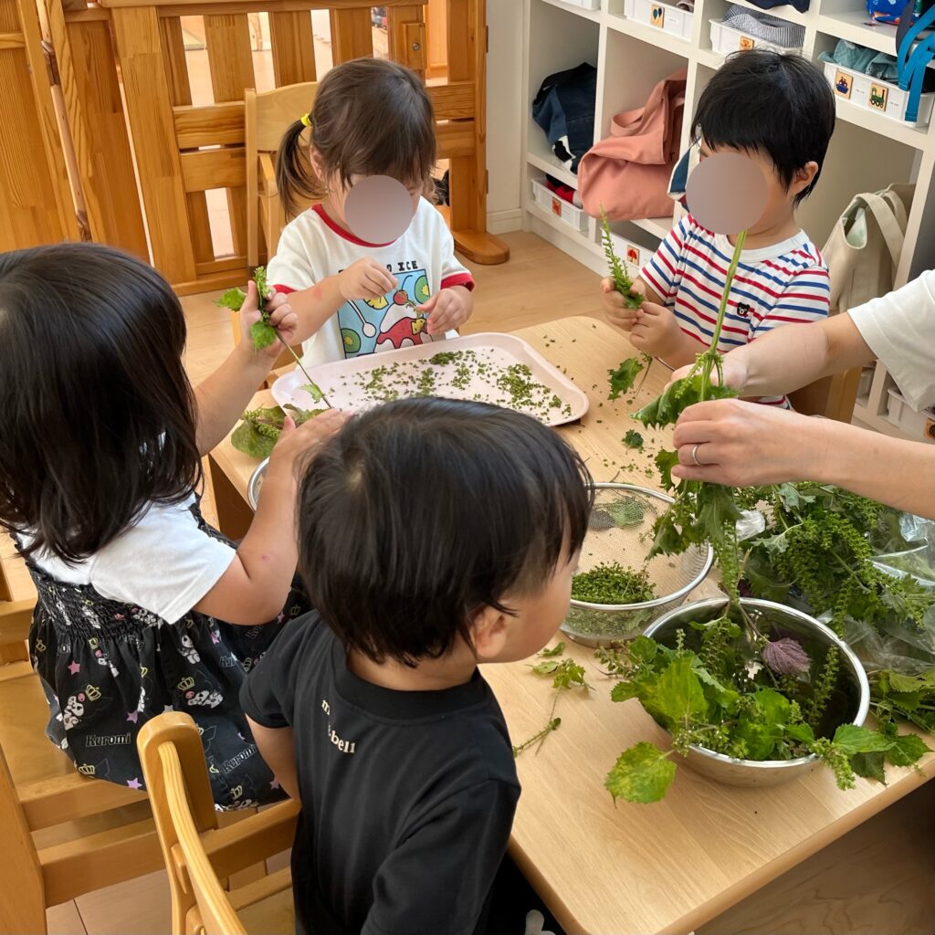 保育園に戻り、シソの実を茎から取るお手伝いをしてくれました。