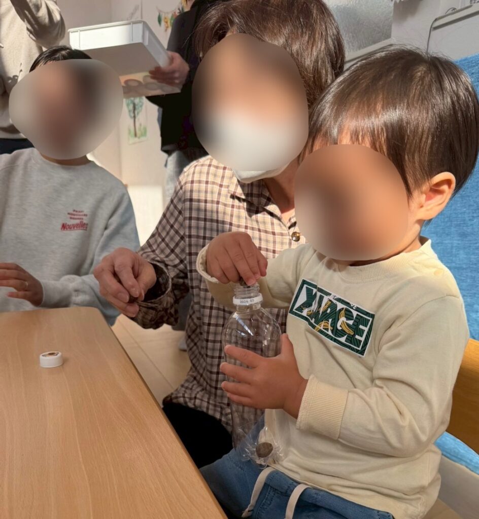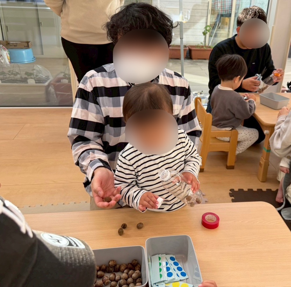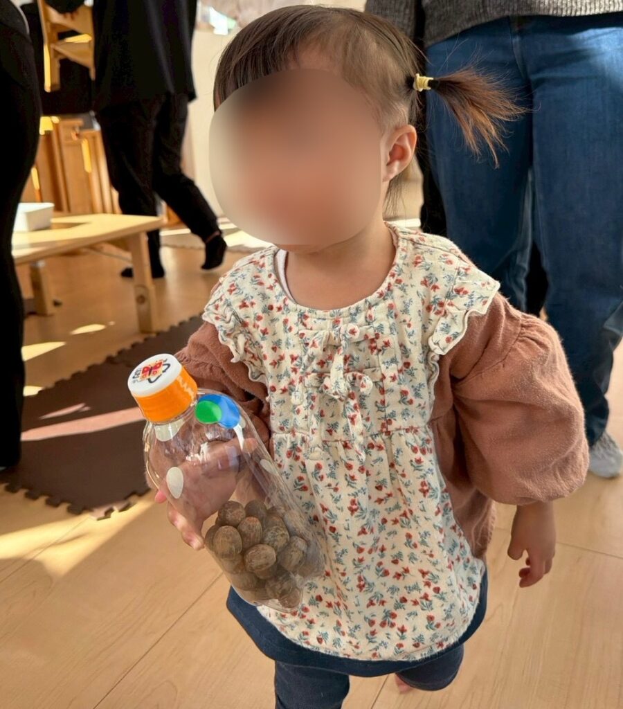 こどもたちが散歩で拾ったたくさんのどんぐりをペットボトルに入れました。