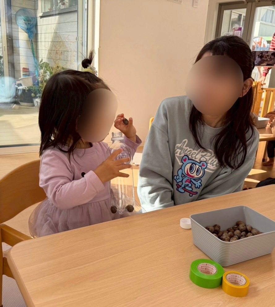 秋の歌を楽しんだ後は、どんぐりマラカスを作りました。