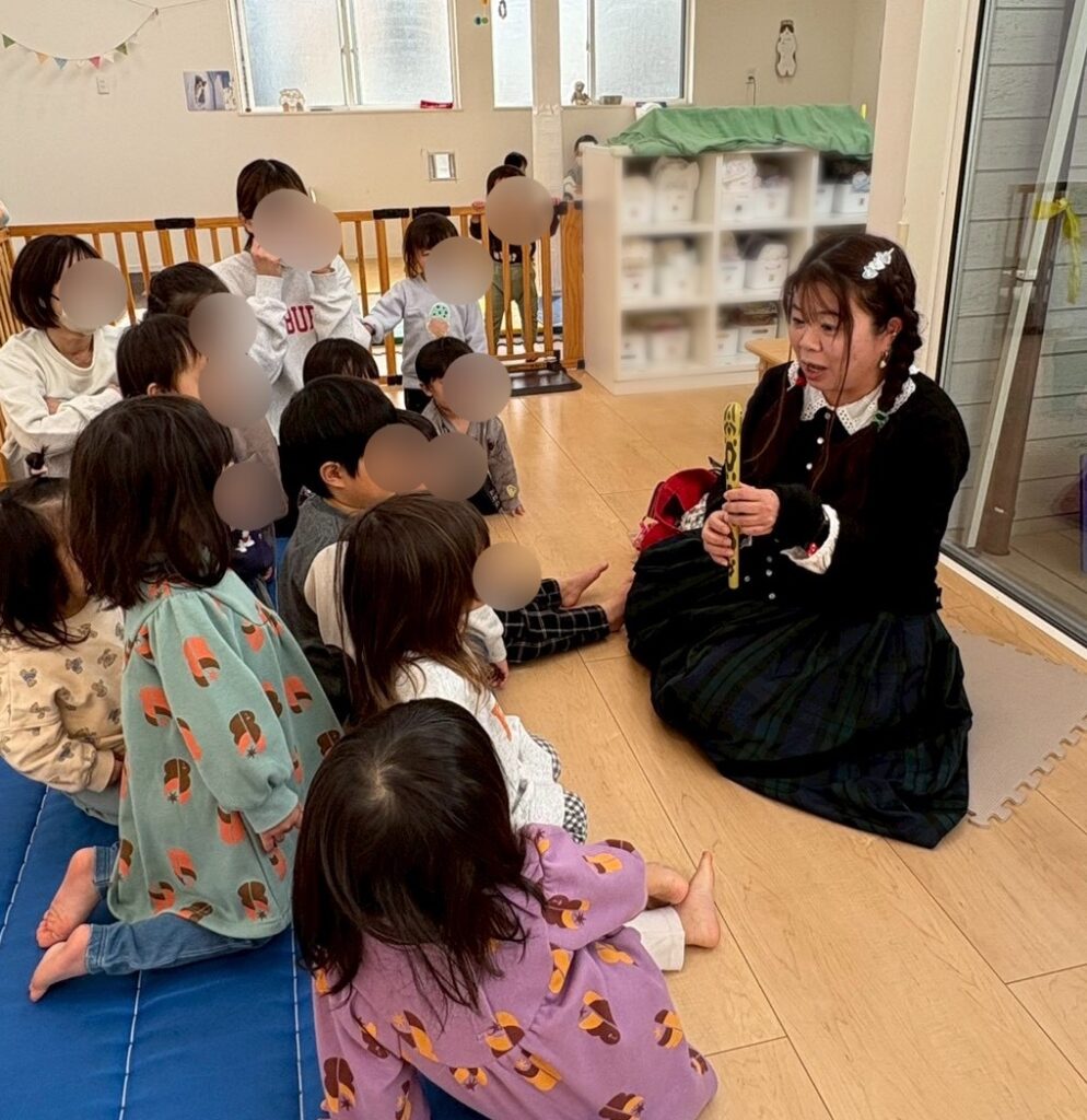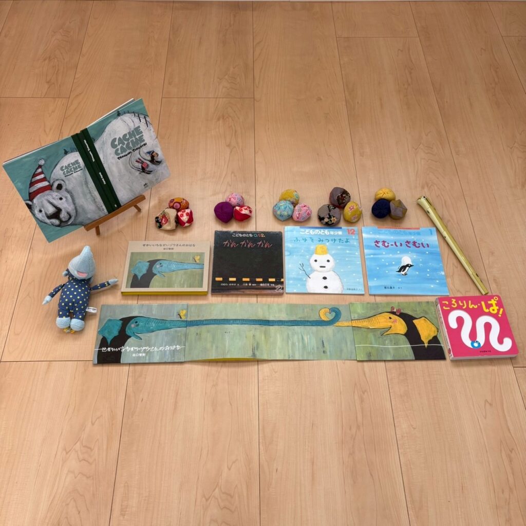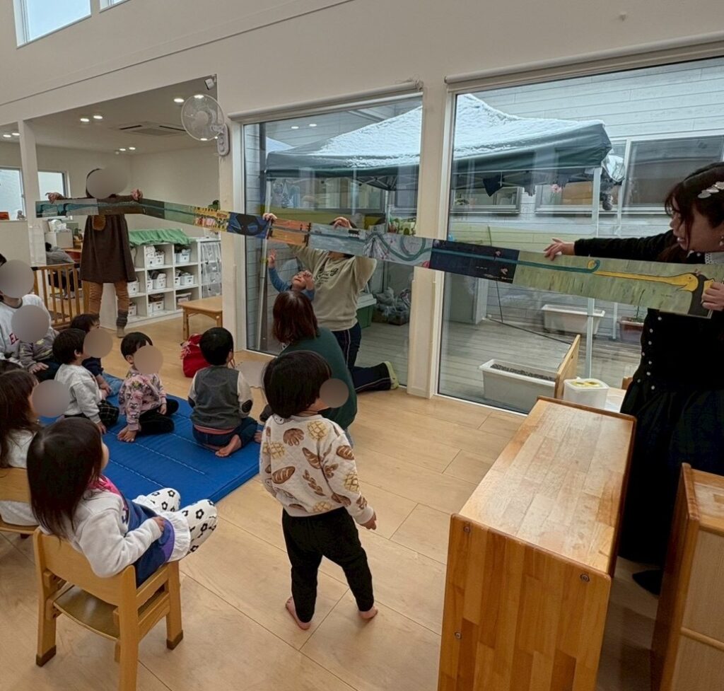 りんご組(1,2歳)では、ぞうさんの鼻がどんどん長~くなっていくところに惹き込まれ、おもしろそうに見ていました。