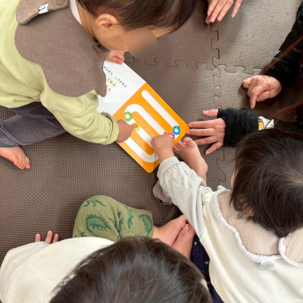 いちご組(0歳児)では、指で動かすところころ転がるしかけに興味を持ち”ぼくも!わたしも!”と近くに来て楽しんでいましたよ。