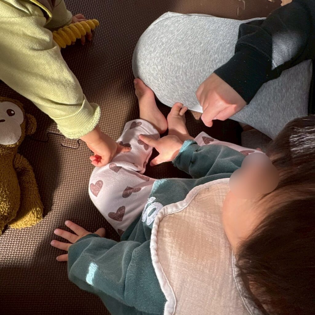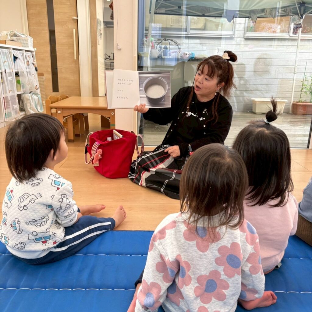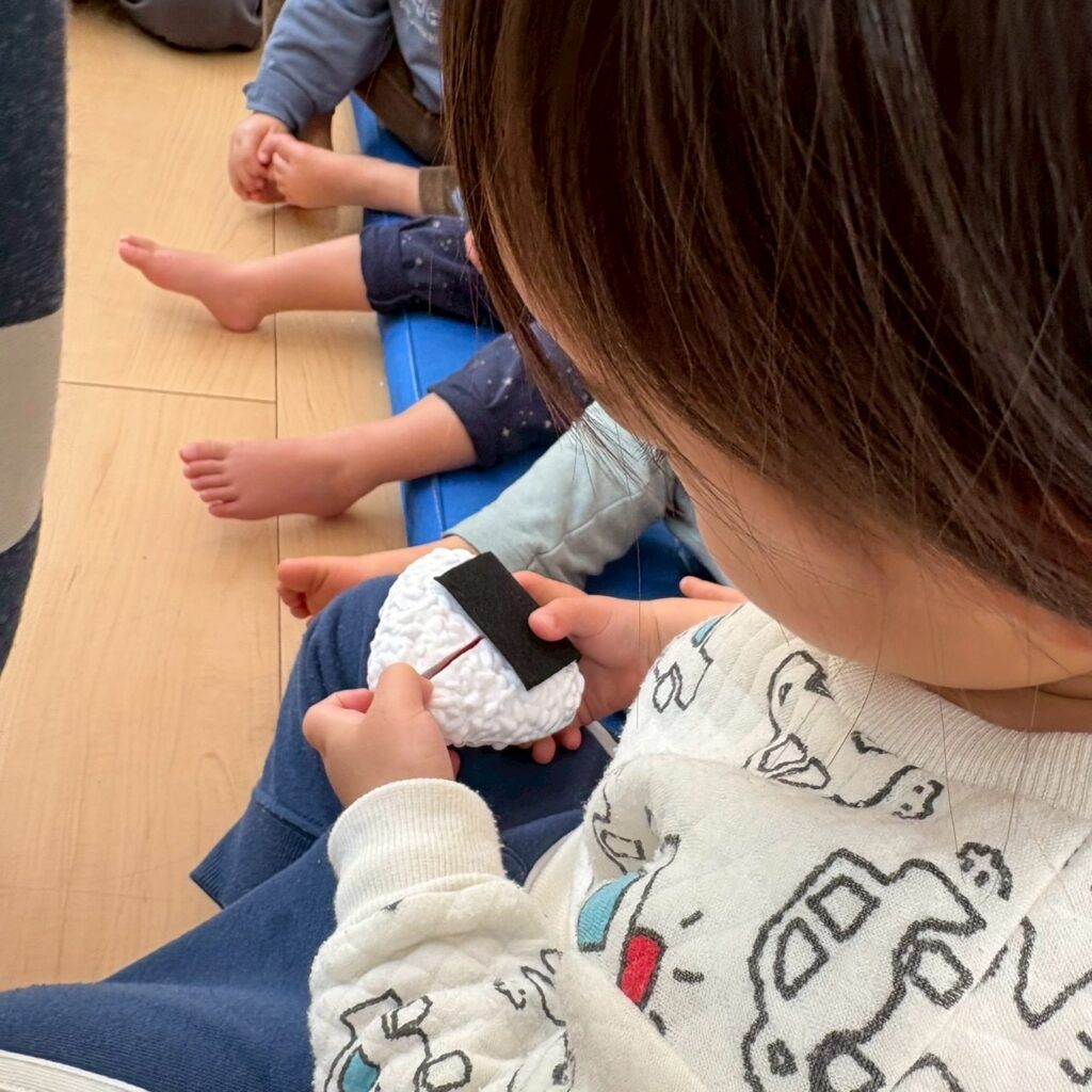 1歳児さんは、おいしそうなおにぎりの絵本に興味を持っていました。食べる真似をして楽しんでいましたよ。