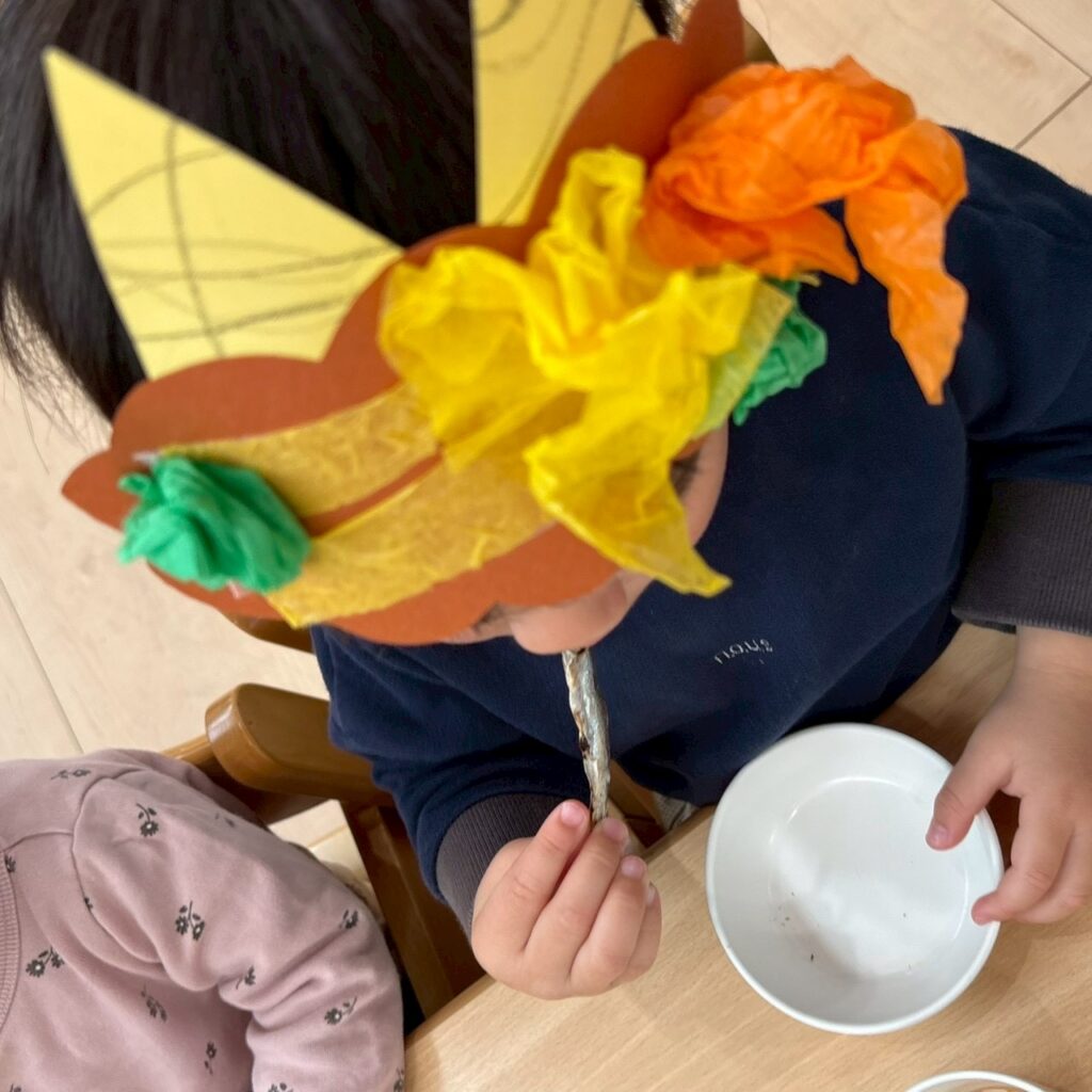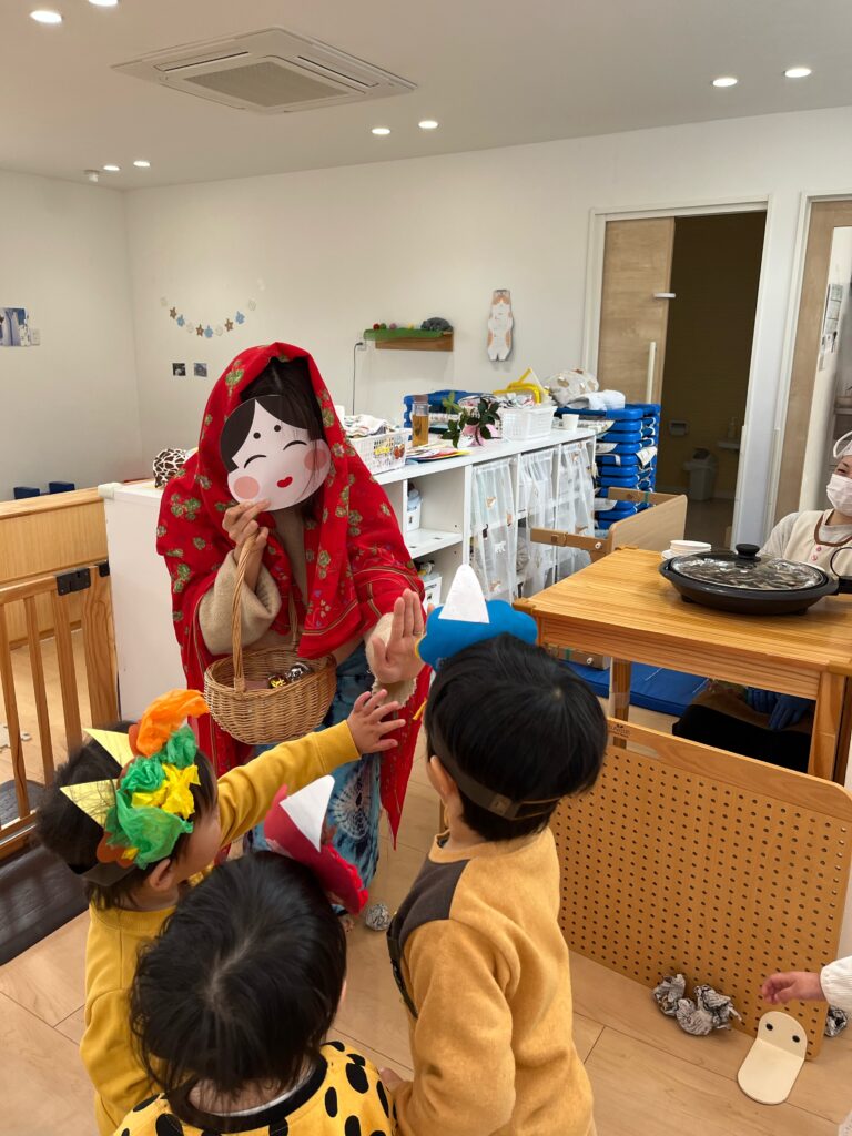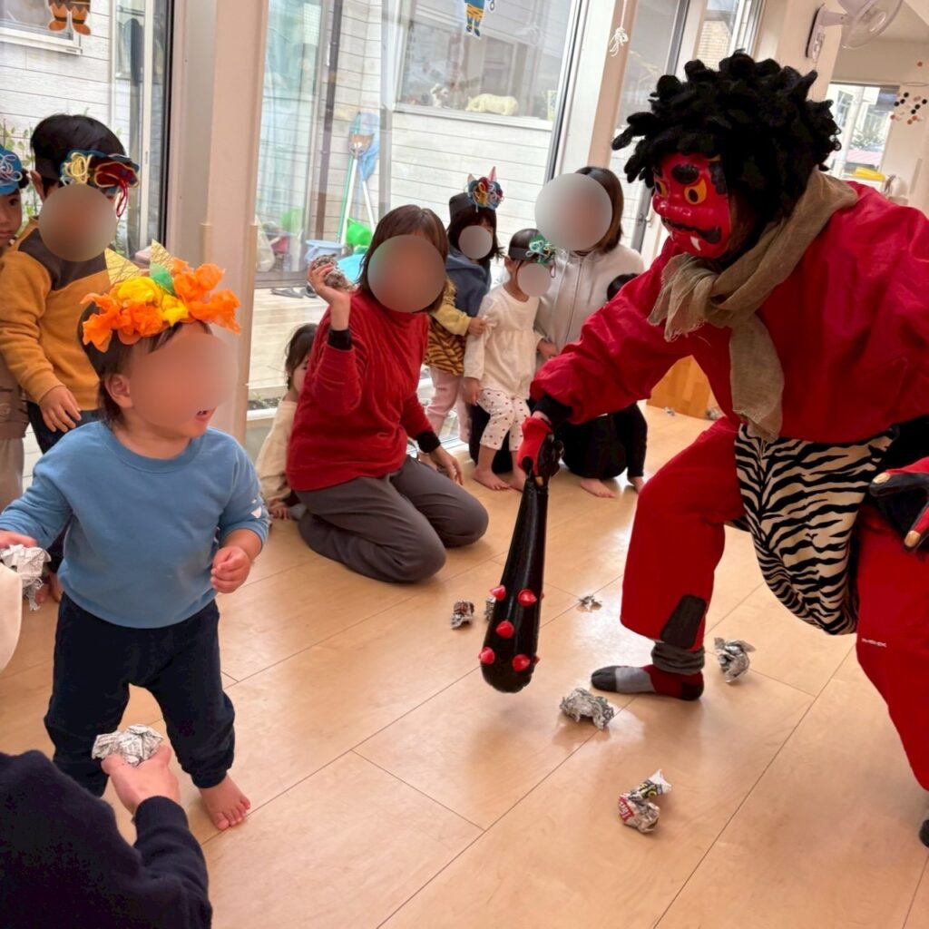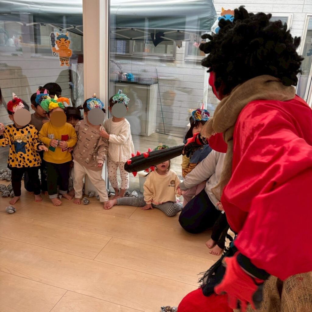 はじめは鬼の登場にびっくりしていた子も、大人やともだちと一緒に、「おにはそと、ふくはうち」と豆まきをしました。