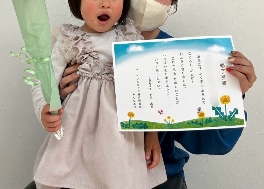そして、3月で卒園するこどもたちに証書とお花のプレゼントがありました。