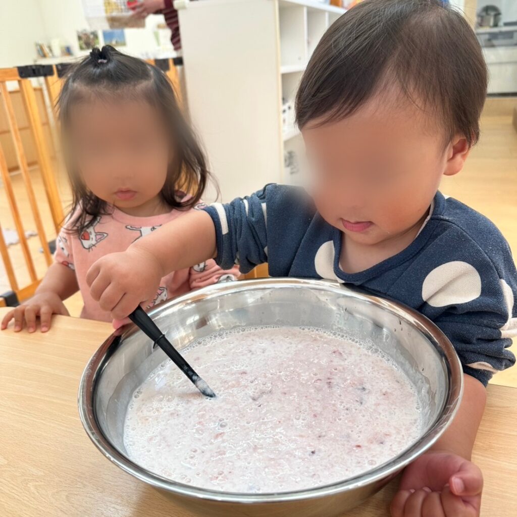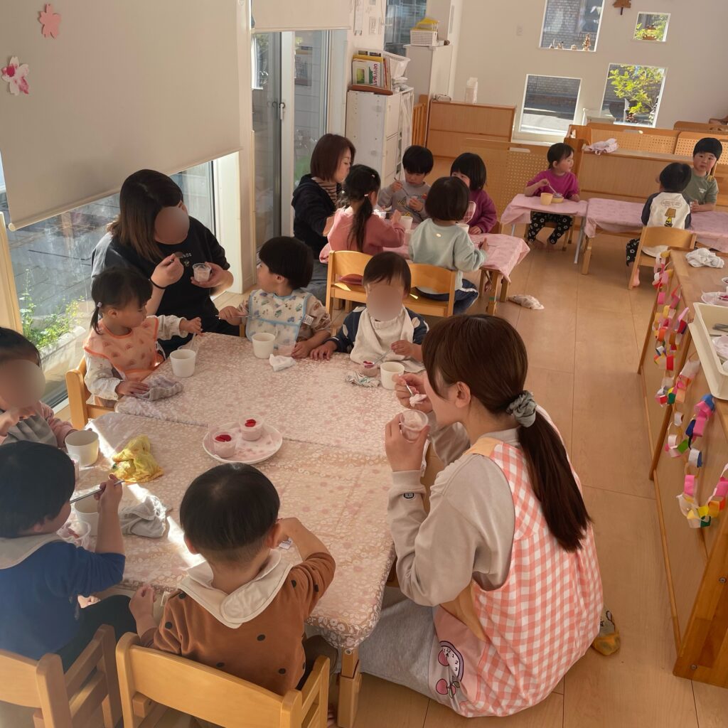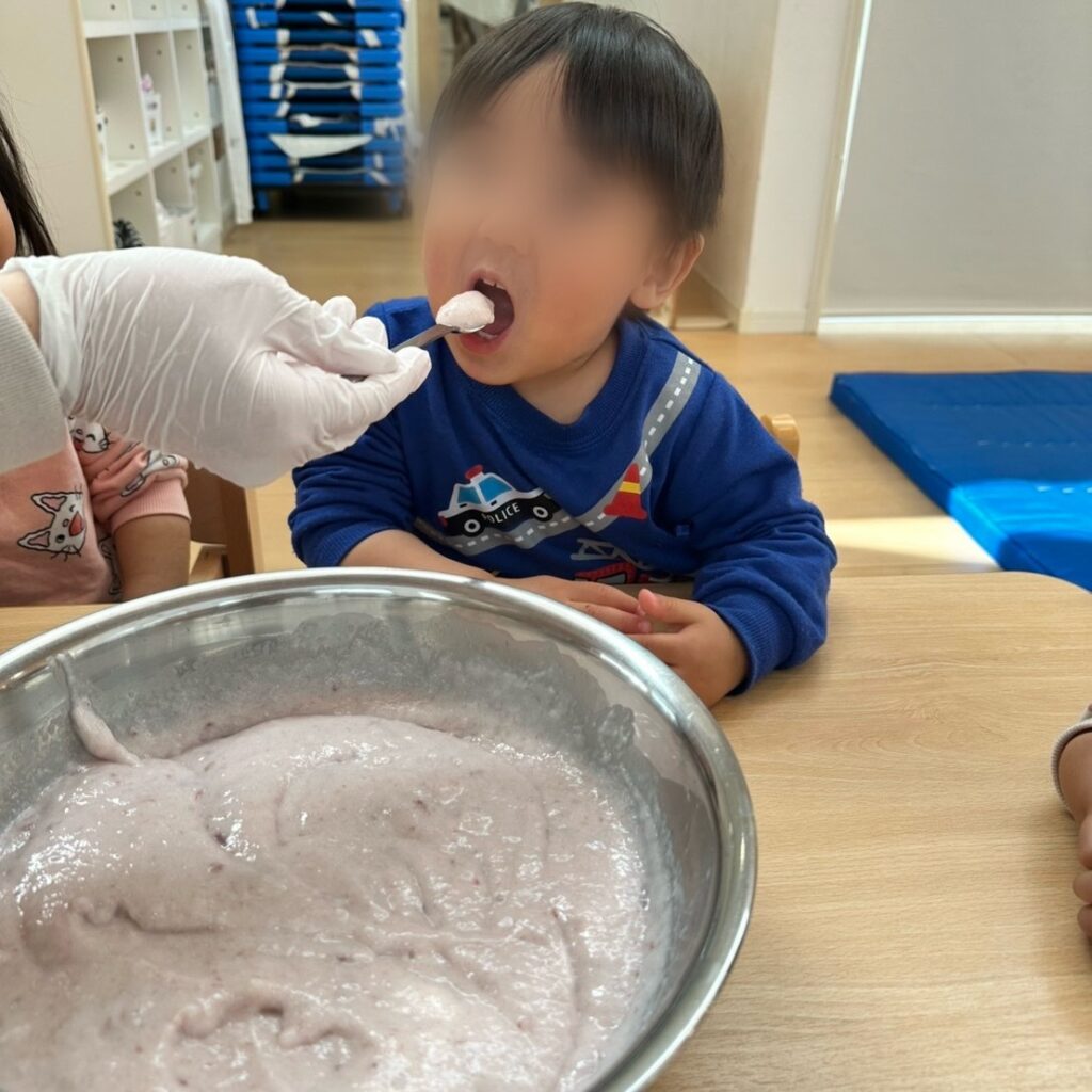 午後のおやつはたんぽぽチームさんへのサプライズで、どんぐりチーム(1歳児)さんがおやつを作ってくれました。